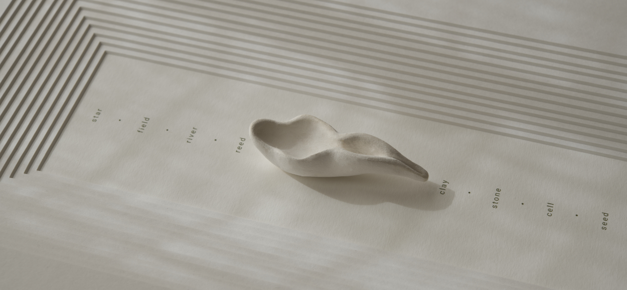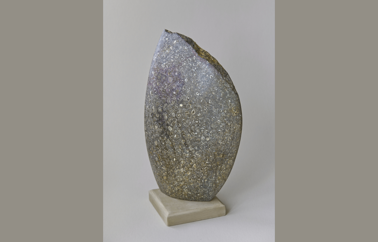 ‘Over 134 million years ago, colonies of tiny shells formed in Wealden lagoons and the braided riverbeds of the sub-tropical Valanginian age. Now embedded in iron-rich calcitic stone, the fossils of those bivalves may still be discovered as rough-surfaced rocks in the fields and pools of Lossenham. This sculpture’s monolithic form honours the ancient curves of the disarticulated bivalves seen within the stone’s matrix, reminding us that the materials in our sedimentary landscapes were once components of entirely different ecosystems and, by working the stone with chisels and files, the rocks’ minerals are returned to the silt and soil to be recycled in a myriad of ways.’