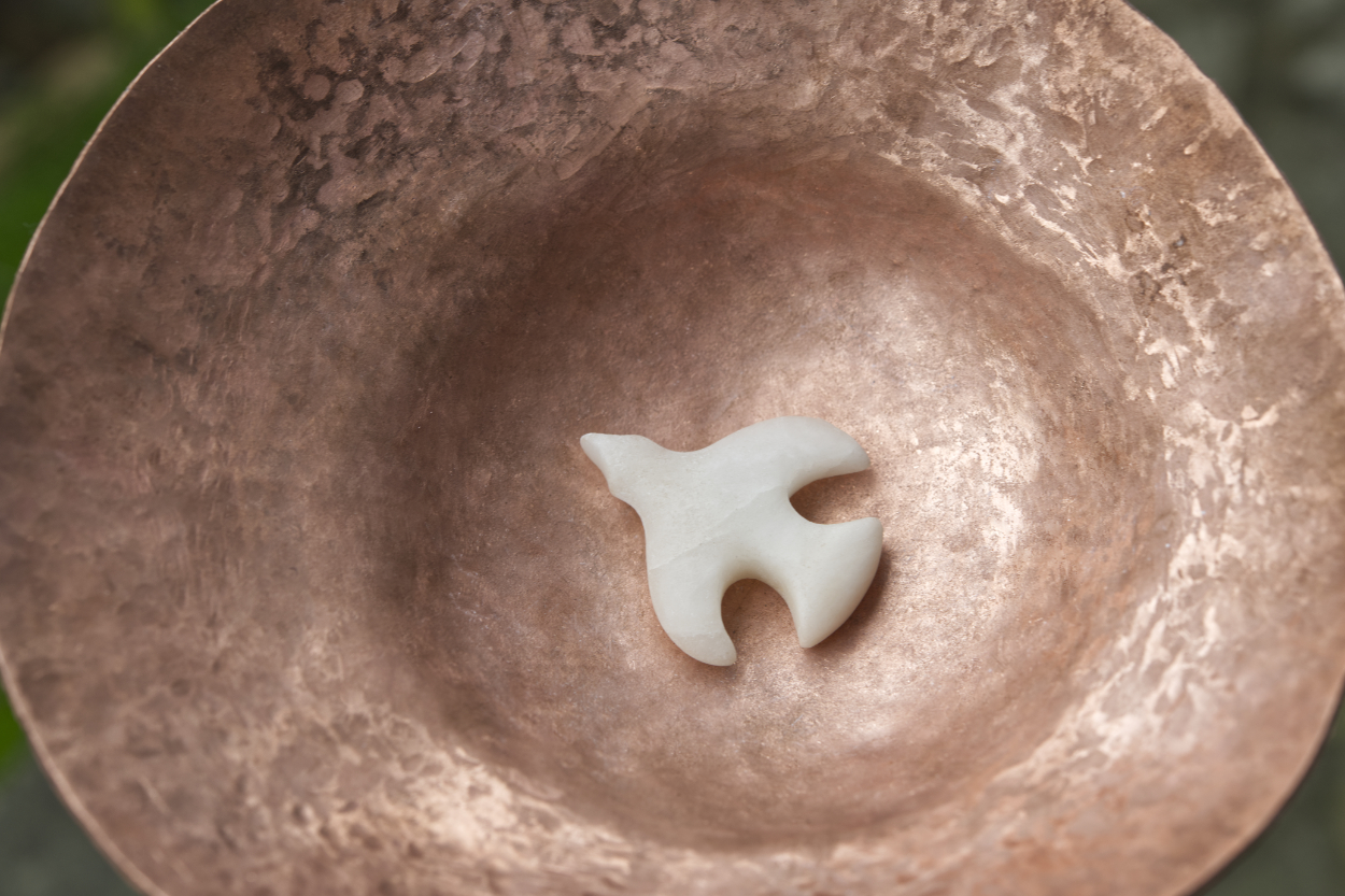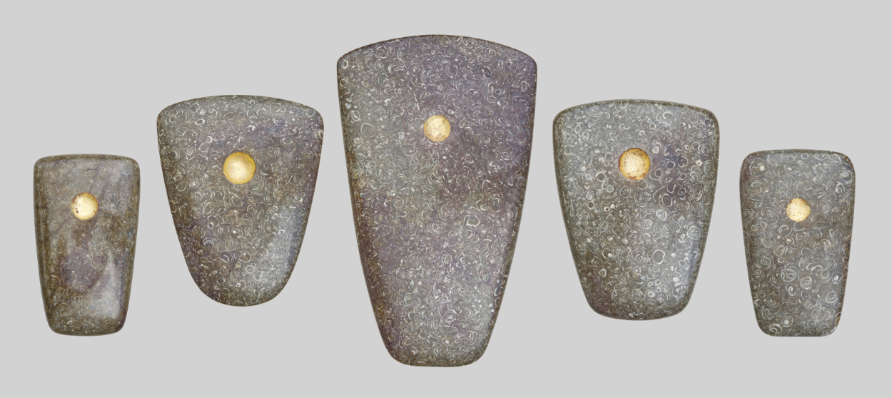 ‘In this series, the axe form is understood to be one of the oldest and longest-used man-shaped objects. It may be seen equally as creative or destructive: a tool to deforest the world, or a tool to shape a work of art. The axe has long been used as a votive object, a symbol of polarity, of both light and darkness. It appears as a mythic symbol in many cultures: the Keraunos, thunder weapon of Zeus, the double-edged Labrys of the Minoans, or the Tibetan Dorje… all metaphysical tools that may be used to shape the spiritual self, or shape the ego. The forms in this series possess a concave hollow, a portal to the vitality of the stone itself and loci of votive intention.’