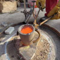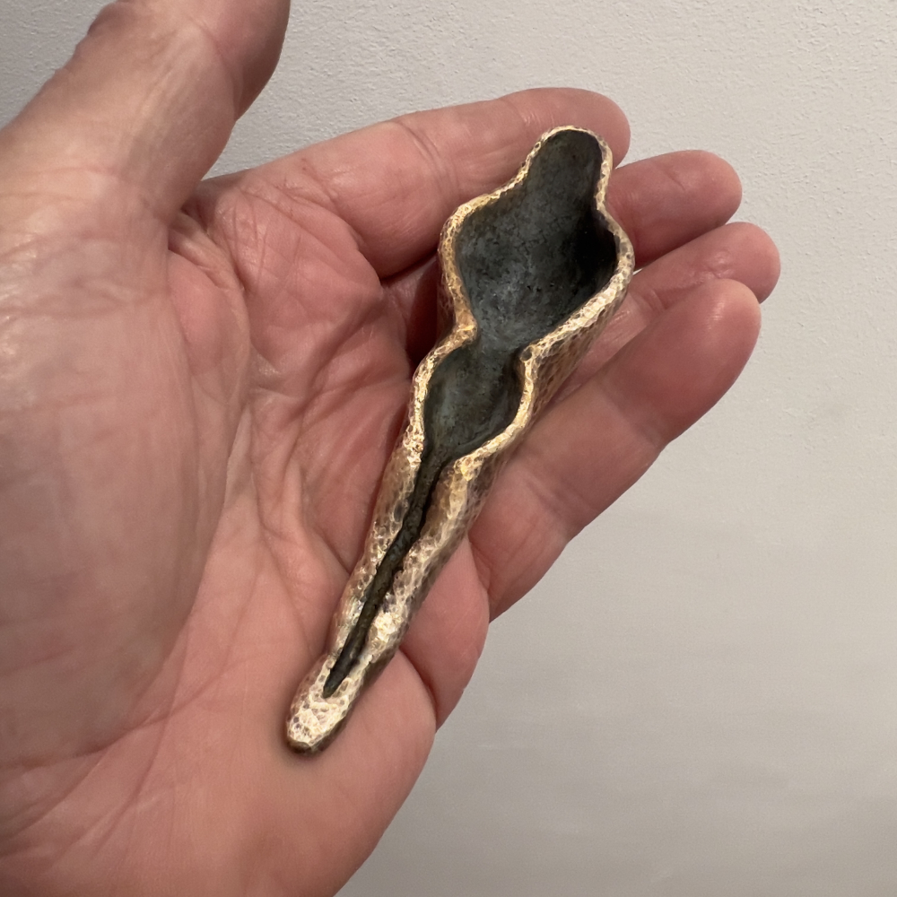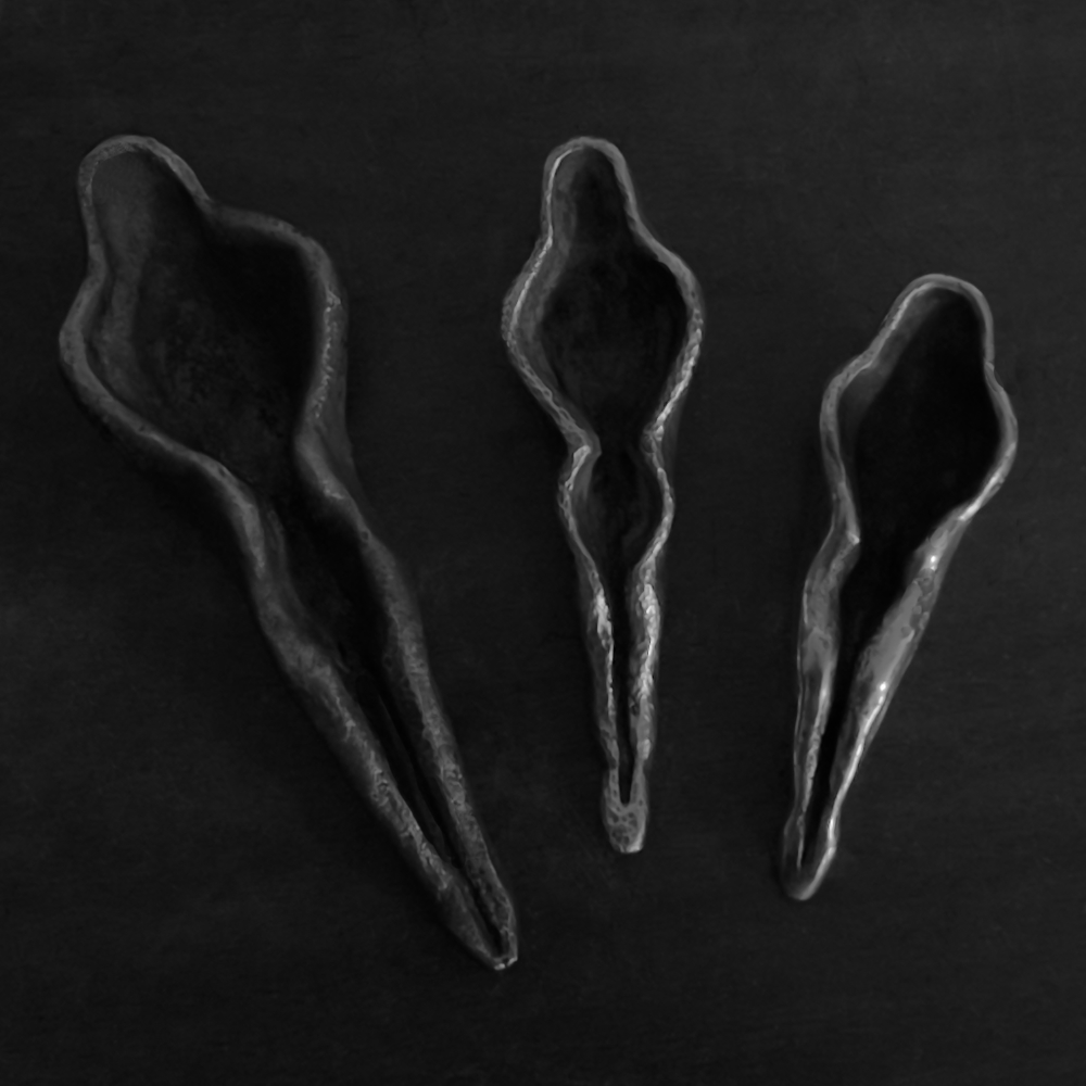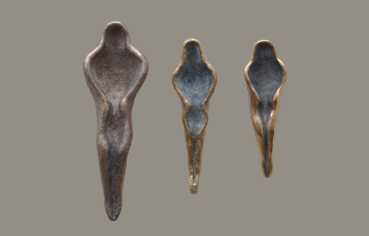 ‘A response to an anthropoid (human-shaped) lead coffin discovered buried in front of the Lossenham Priory altar. These figures are shown as empty vessels; they describe the notion of kenosis (self‑emptying), the emptying of self; vessels emptied, ready to be filled, receptive to the experience of a spiritual fullness (pleroma). The Carmelite mystic, St. John of the Cross, evoked imagery of the soul being emptied, purified, or made receptive – nada, a state of unknowing, is reflected upon in St. John’s ‘Dark Night of the Soul’.