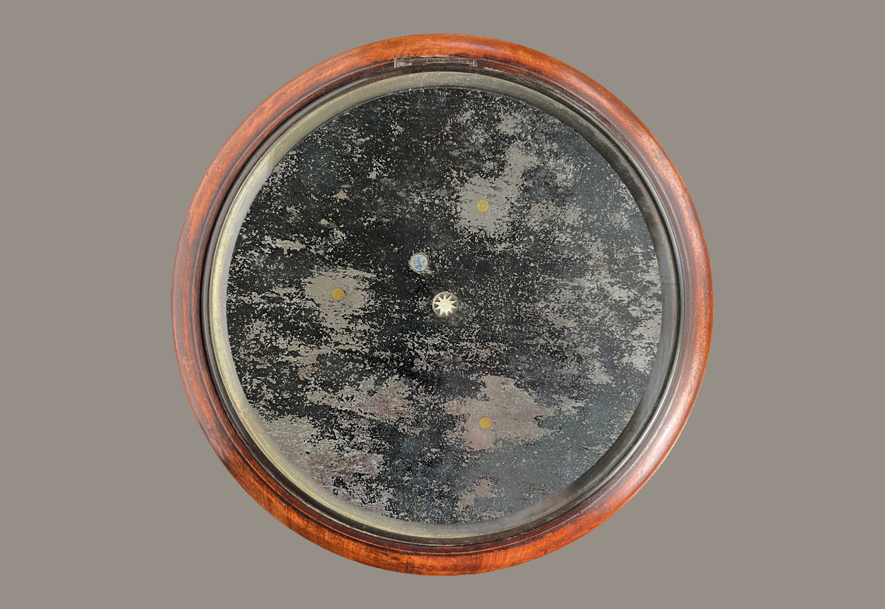 ‘Here the face of the artist’s childhood clock has been removed to reveal what lies behind, a worn steel backing plate with a sense of the night sky. The central hand hole now filled with a foraged boot stud of mother-of-pearl and, reminiscent of the planet Earth, a sodalite bead inhabits the winding hole. Three brass mechanism posts complete the constellation, and where hands that measured the minutes and struck the hours once orbited numerals, a celestial diorama of timefulness has emerged.’